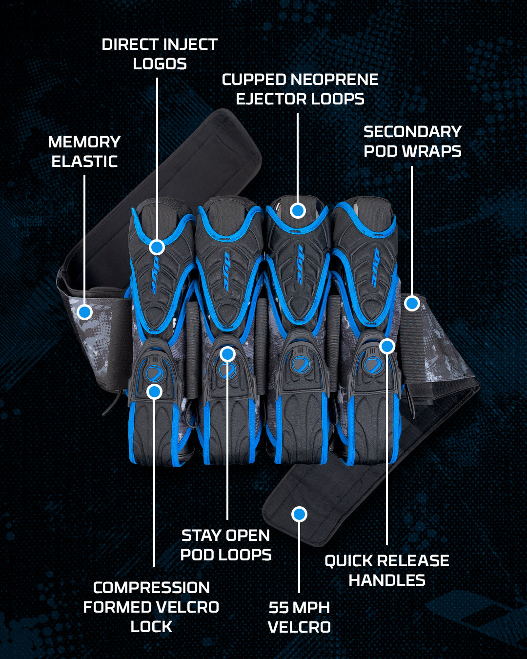 CUPPED NEOPRENE EJECTOR LOOPS: This is the area that stretches around the actual pods. Instead of depending on elastic straps to keep your pods in place, we have developed a specific pattern of compression neoprene that actually wraps around the pod itself, and causes a downward tension. This design keeps the pods securely in place, while being able to forcefully eject the pods from the loops whenever you're ready to pull that quick release. Direct inject is also featured to make it look good. As we discussed before, style is key.