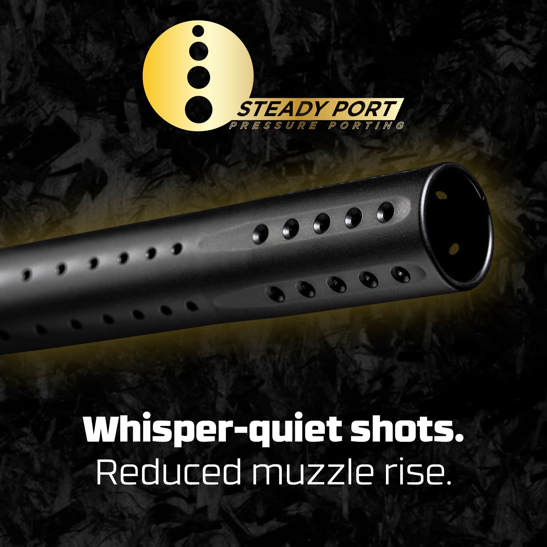 DYE’s signature porting pattern delivers whisper-quiet performance and reduces muzzle rise for a flatter, more controlled shot string.