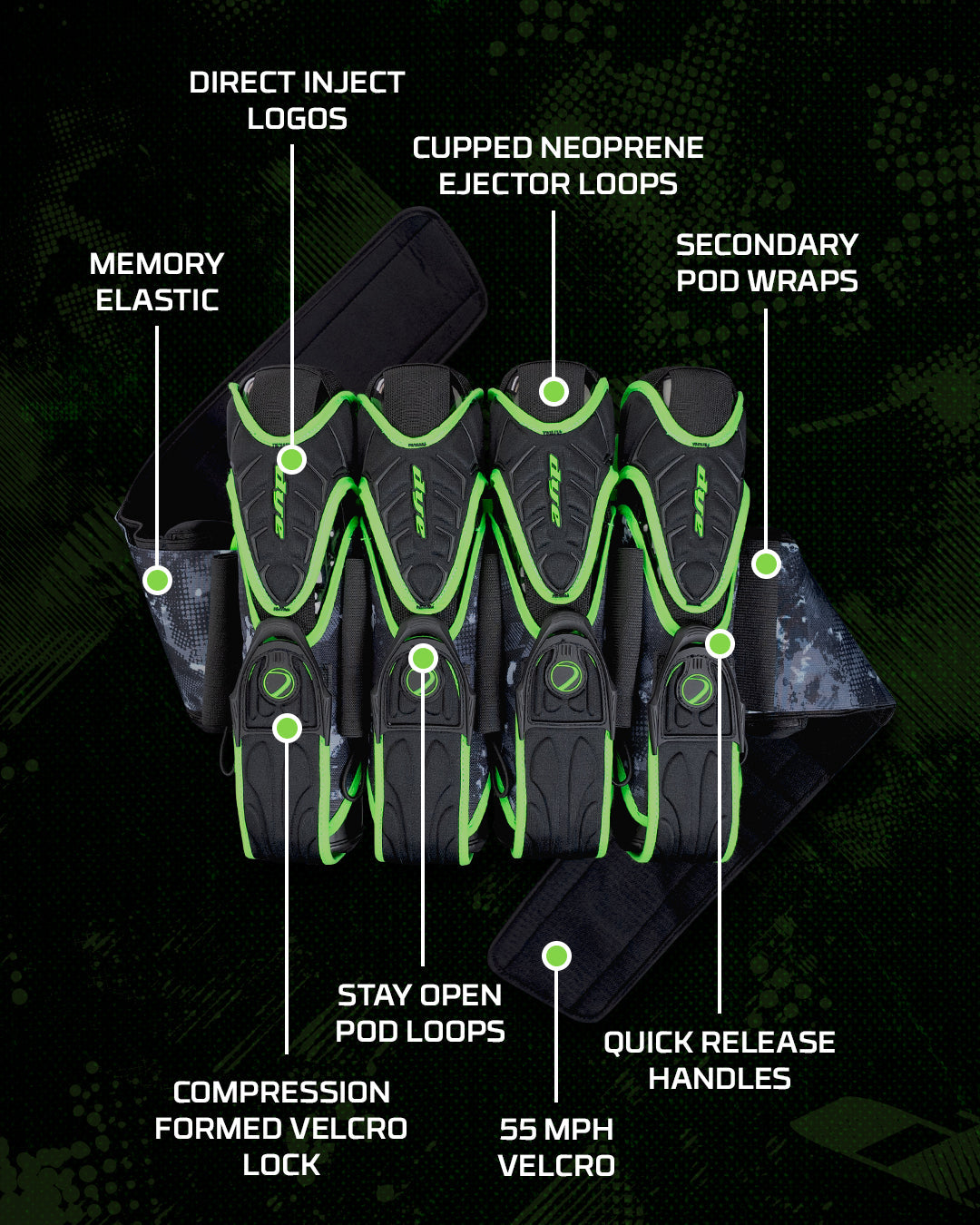 SECONDARY POD WRAPS: With today's games having multiple formats, you need a versatile harness. The New Assault Harness has been designed to be used in NXL style games as well as larger format games. To accommodate for this we have included secondary pod wraps between each pod loop, and on the outsides of the pod loops. This allows you to carry 3 pods up to 9 pods.